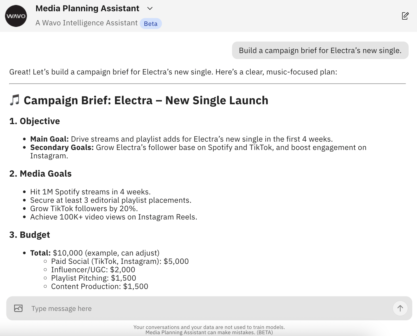 To make this process easier, we’ve built the Wavo Media Planning Assistant. It guides you through writing a structured, actionable brief — designed specifically for music marketing.